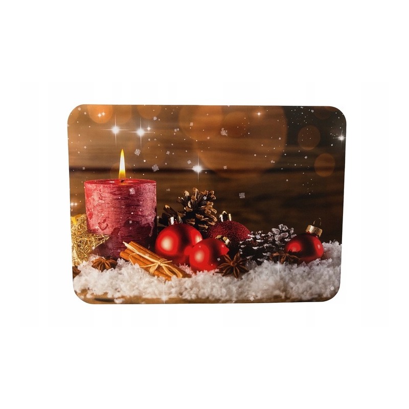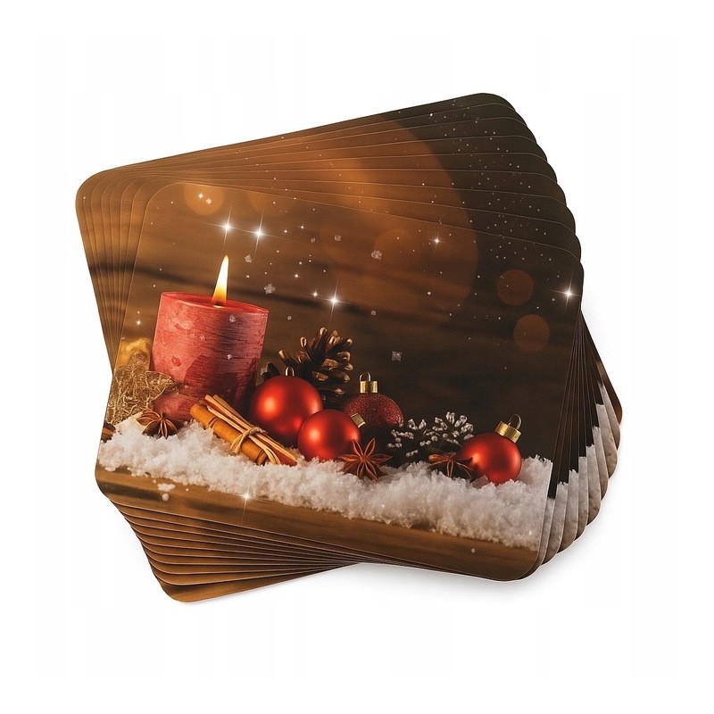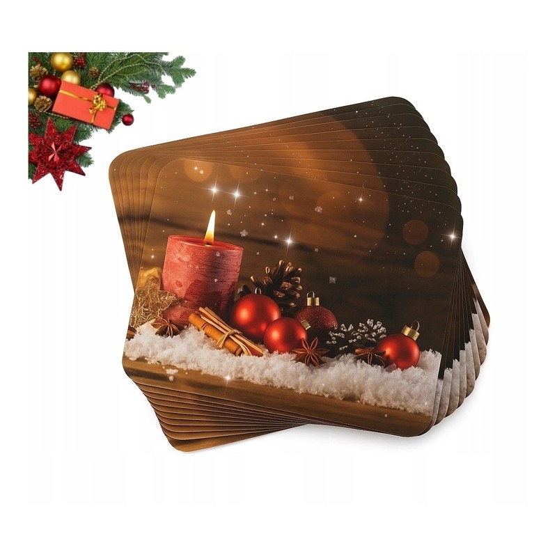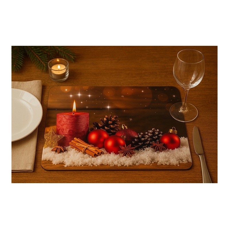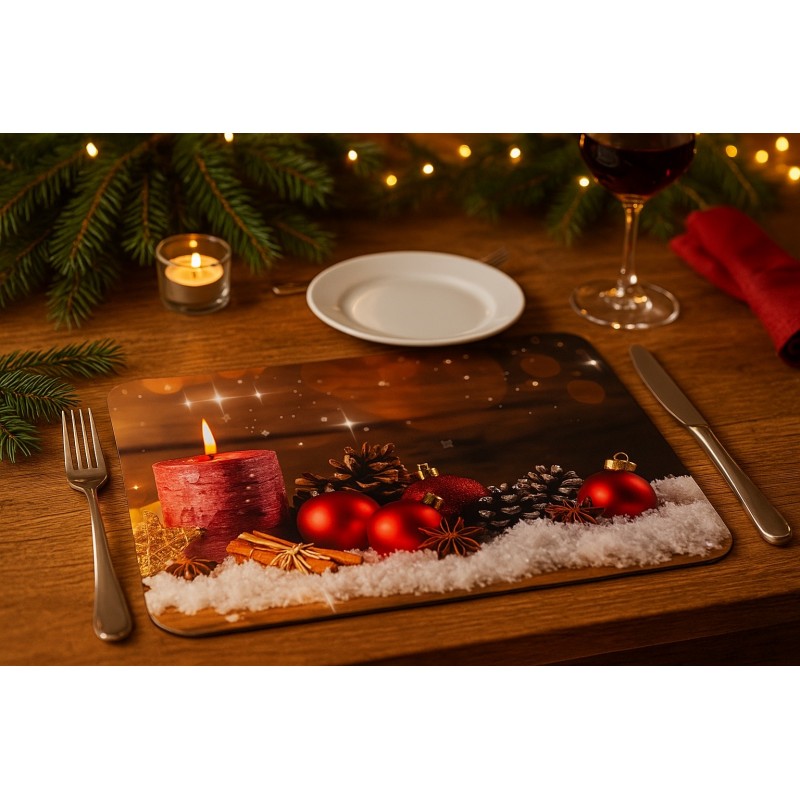 ❄️Piękna, świąteczna podkładka stołowa z motywem świecy, bombek i zimowych ozdób doda Twojemu wnętrzu ciepła oraz uroku podczas rodzinnych spotkań i wigilijnej kolacji. Wykonana z wysokiej jakości tektury laminowanej, łączy estetykę z funkcjonalnością – idealna zarówno do codziennego użytku w okresie świątecznym, jak i jako element dekoracyjny stołu.