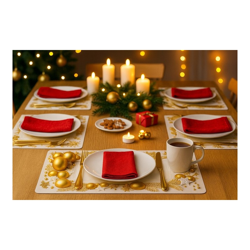 Bo liczy się atmosfera i styl! Nasze świąteczne podkładki to nie tylko praktyczna ochrona stołu, ale również elegancka dekoracja, która w kilka sekund odmieni Twoje wnętrze. Doskonały wybór dla tych, którzy cenią estetykę, funkcjonalność i świąteczny klimat.