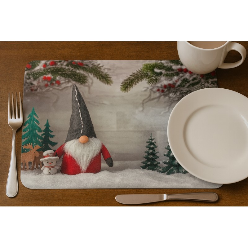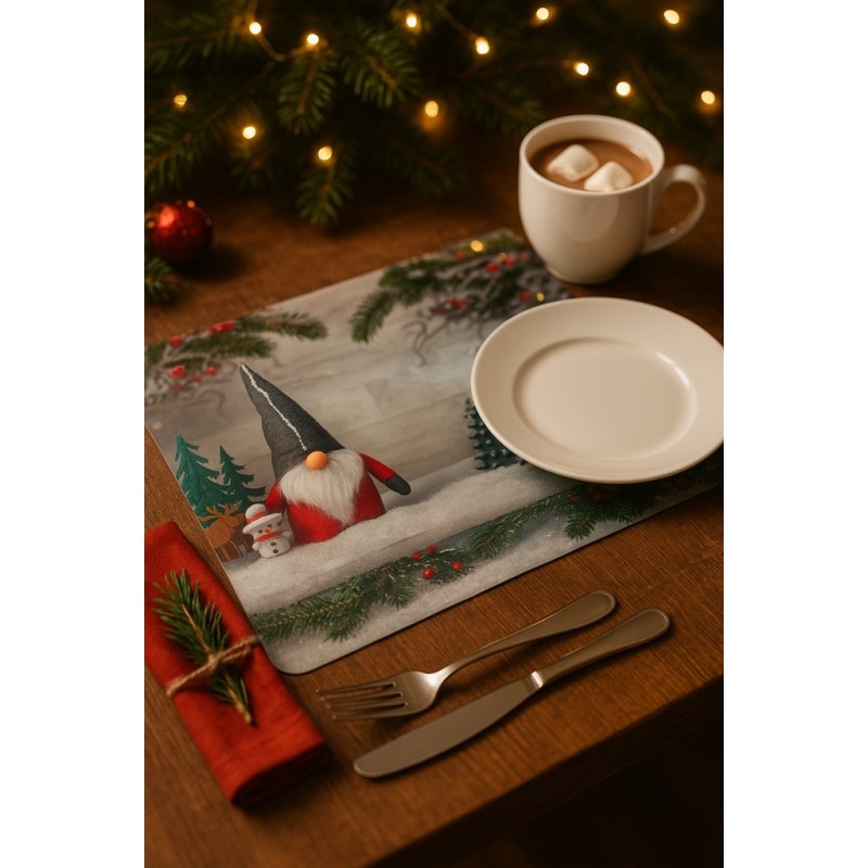 ☃️Wprowadź świąteczny nastrój do swojego domu dzięki wyjątkowym podkładkom świątecznym z uroczym motywem zimowym! Na każdej podkładce znajduje się bajkowa sceneria przedstawiająca gnoma w czerwonym ubraniu, towarzyszącego mu bałwanka oraz śnieżne drzewka i renifera — wszystko otoczone gałązkami świerkowymi z czerwonymi jagodami.