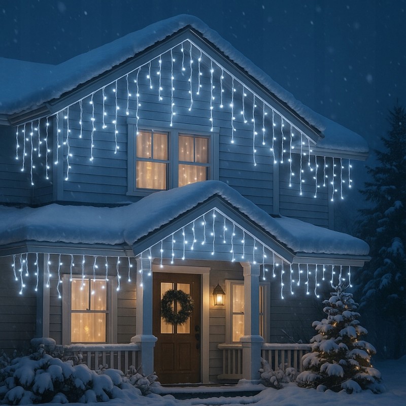 To profesjonalne oświetlenie dekoracyjne, które idealnie nadaje się do ozdobienia elewacji budynków, ogrodzeń, balkonów, tarasów czy wnętrz. Jasne, chłodne światło wprowadza elegancki i świąteczny klimat – idealny na zimowe wieczory.