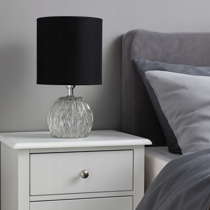 ➡️Lampa stołowa ZEFIR E14 BLACK łączy funkcjonalność z estetyką. Jej szklana, transparentna podstawa z subtelnym zdobieniem nadaje wnętrzu elegancji, a czarny abażur równomiernie rozprasza światło, tworząc przyjemną atmosferę.