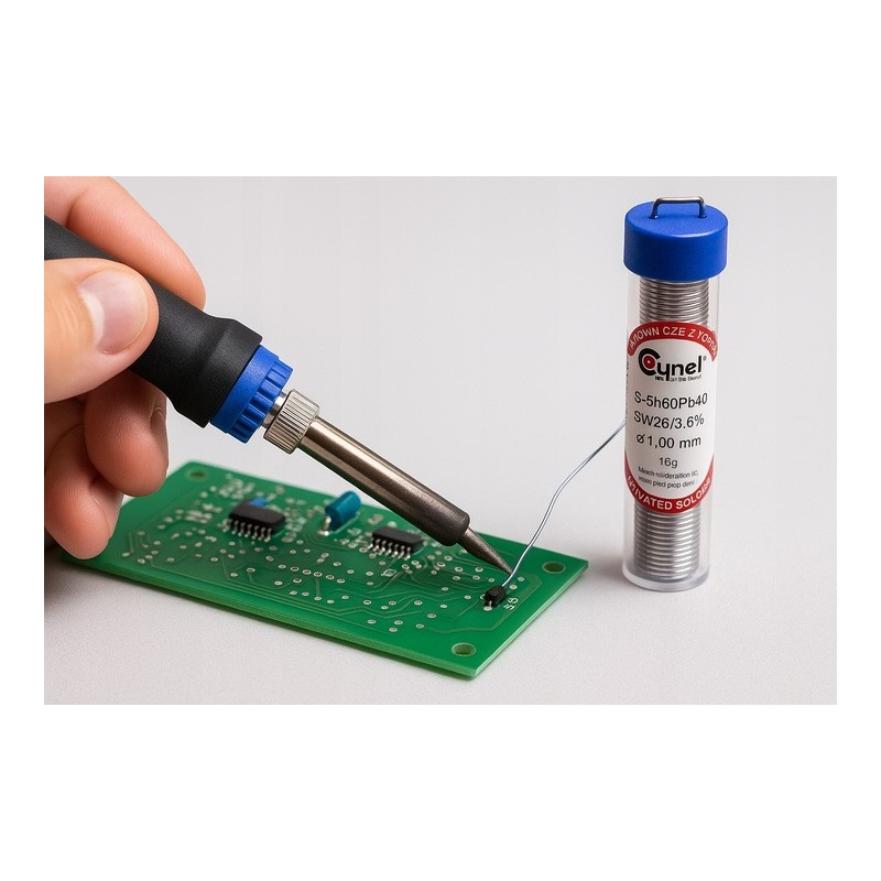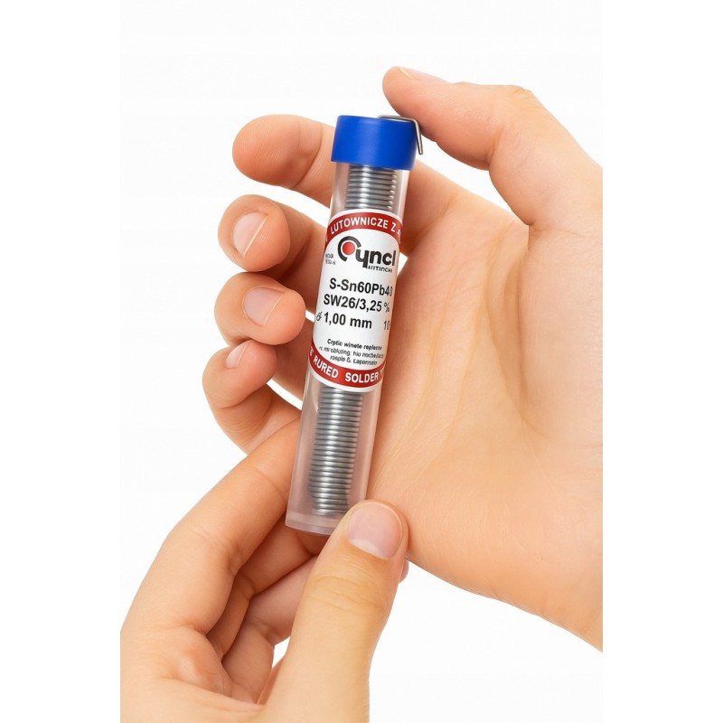 ✴️Cyna lutownicza CYNEL o średnicy 1 mm i wadze 16 g to wysokiej jakości spoiwo lutownicze stworzone z myślą o wymagających użytkownikach branży elektronicznej i elektrotechnicznej. Produkt wykonany został z pierwszego wytopu cyny i ołowiu zgodnie z normą PN-EN 29453:2000, co gwarantuje jego najwyższą czystość i powtarzalność parametrów.