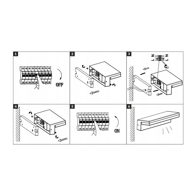 3. Przeciągnij przewód zasilający przez otwór w ramce montażowej a następnie przykręć ramkę w wybranym miejscu. Podłącz przewody do kostki elektrycznej zgodnie ze schematem.