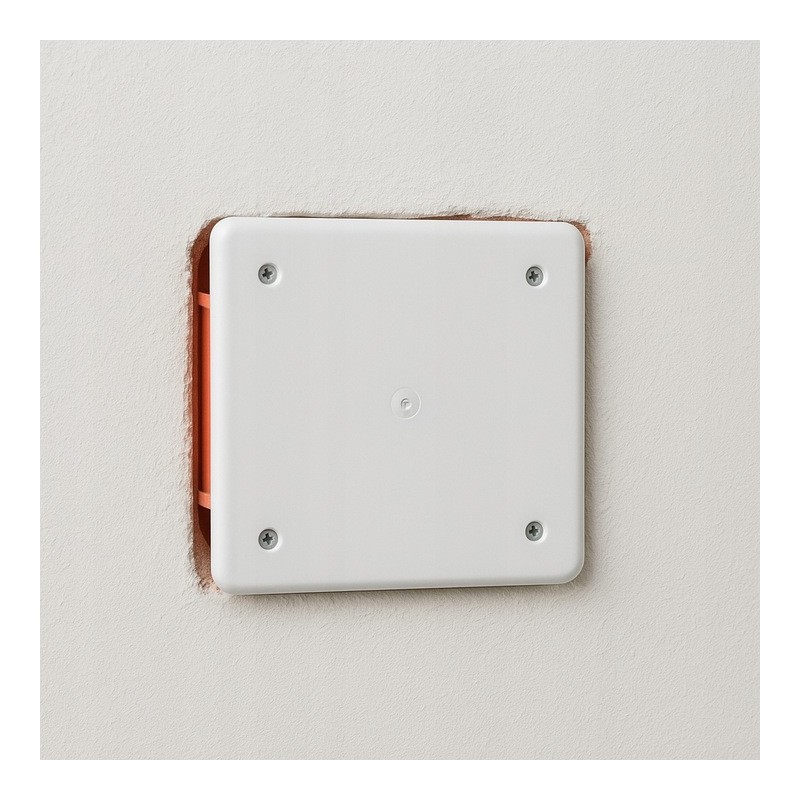Standardowa puszka podtynkowa. Wygodne osłabienia do wyprowadzania przewodów w układzie prostokątnym.