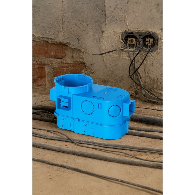 Puszka podtynkowa. Mocne trzymanie w ogipsowanej bruździe dzięki specjalnym występom na bocznych ściankach. Wysuwane przegrody poprawiają sztywność i oddzielają pola izolacyjnie pomiędzy instalacjami.