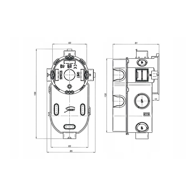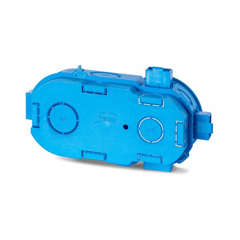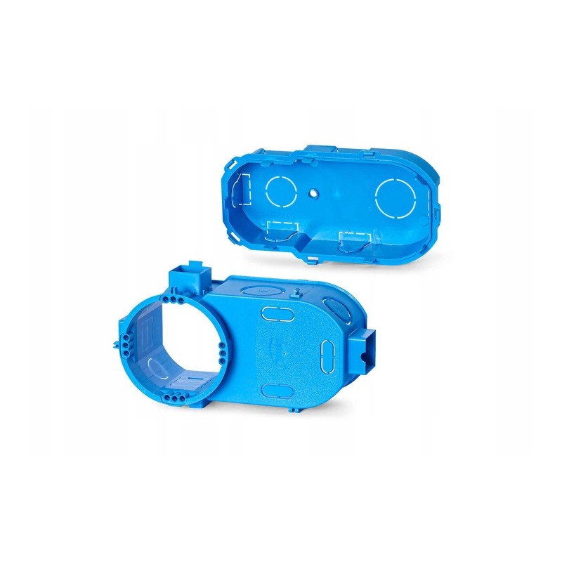 Standardowa puszka podtynkowa. Wygodne osłabienia do wyprowadzania przewodów w układzie prostokątnym.