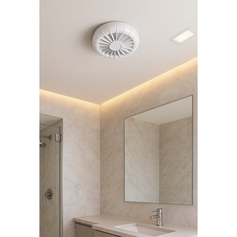 Wentylator wyciągowy z nowoczesnym wzornictwem do zastosowania w pomieszczeniach prysznicowych, łazienkach, kuchniach i innych pomieszczeniach mieszkalnych. Maksymalna wydajność w połączeniu z energooszczędnością.